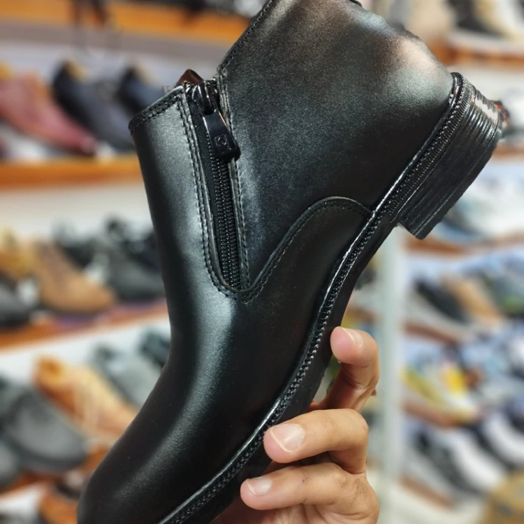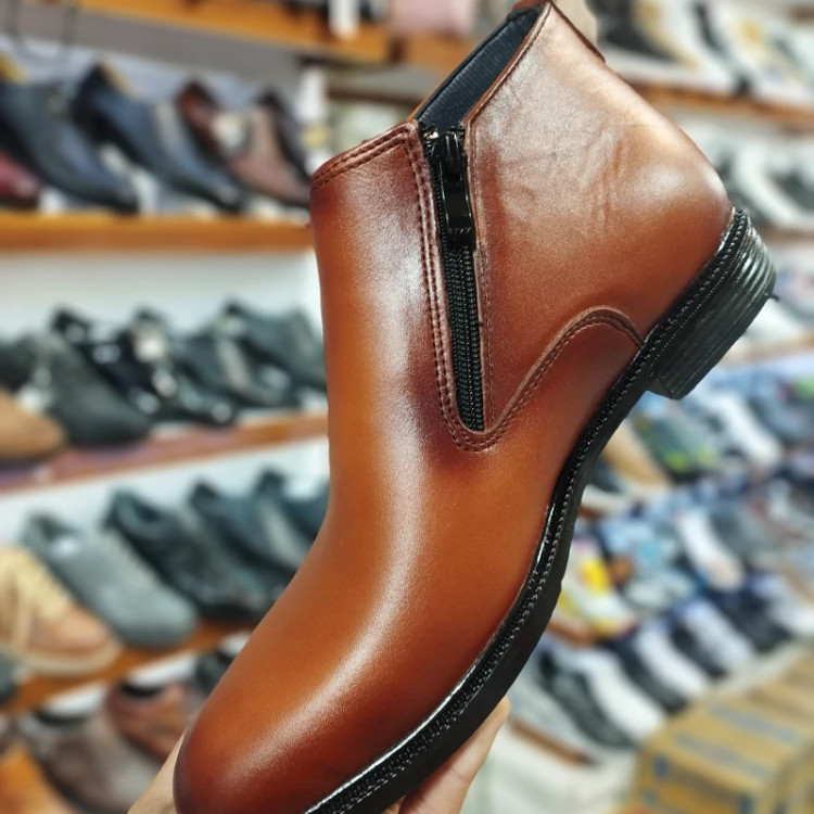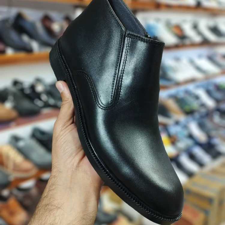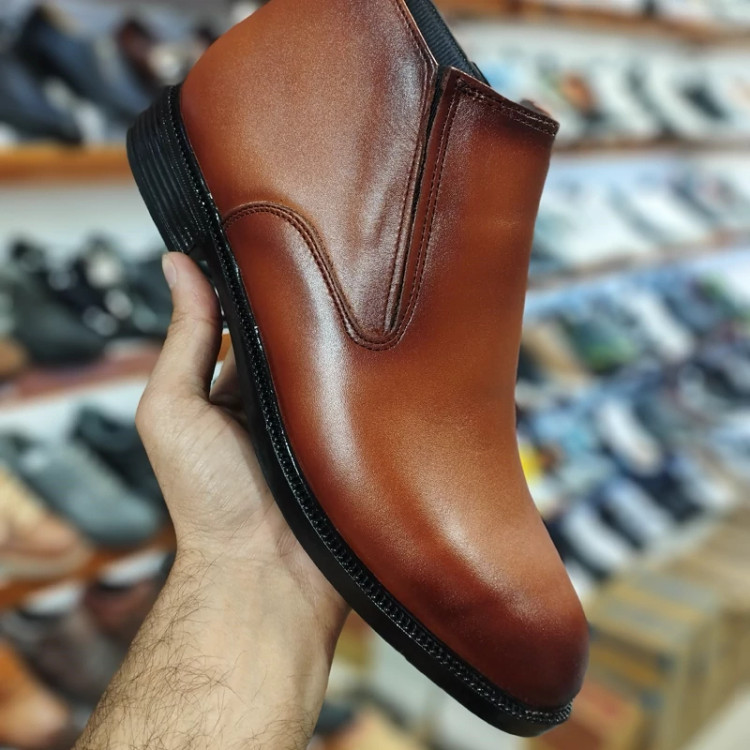 نیم بوت چرم طبیعی بدون بند زیپی با رویه چرم صافتی گاومیش در دو رنگ مشکی و عسلی و زیره پی وی سی و سایز بندی 40 تا 44