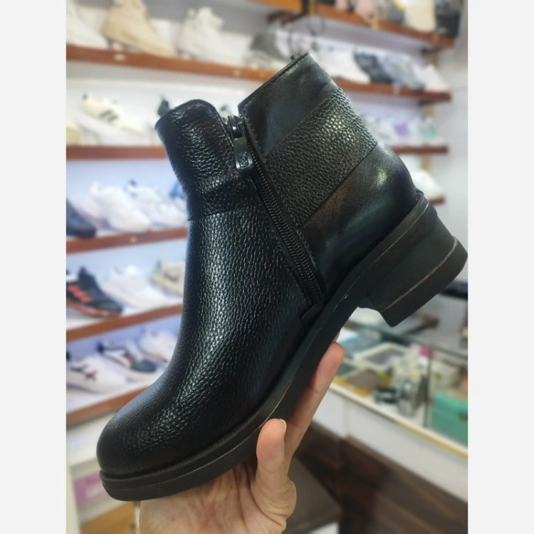 نیم بوت پاشنه کوتاه 4 سانتی با روبه چرم صنعتی فلوتر و زیره پلی یورتان ( پیو) تک رنگ مشکی و سایز بندی 37 تا 40